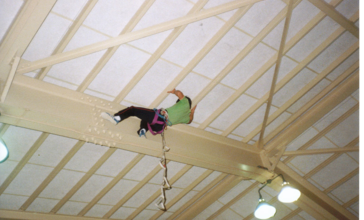 | 坂元さん、文学部5回生。一流のロッククライマーの坂元さんにとって、体育館の天井をはうことは初心者クラスのことらしいです。 |